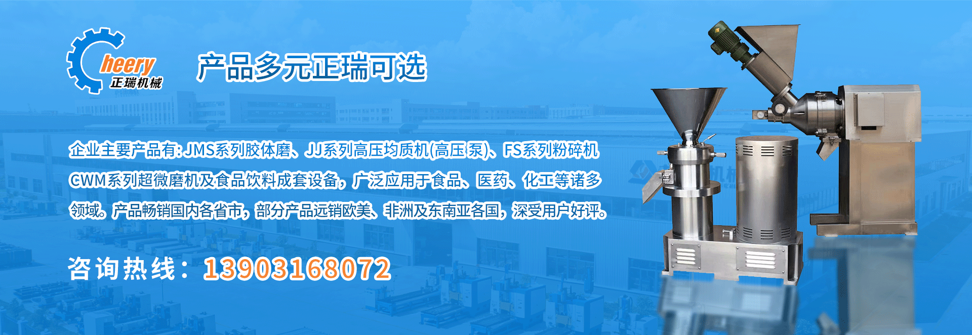公司主要產(chǎn)品有JMS系列膠體磨、JJ系列高壓均質(zhì)機(jī)、FS系列粉碎機(jī)、CWM系列超微磨機(jī)、PG破骨機(jī)系列以及食品飲料成套設(shè)備等。產(chǎn)品廣泛應(yīng)用于食品、醫(yī)藥、化工等領(lǐng)域,暢銷國內(nèi)并出口歐美、非洲、東南亞等國家,深受用戶好評。